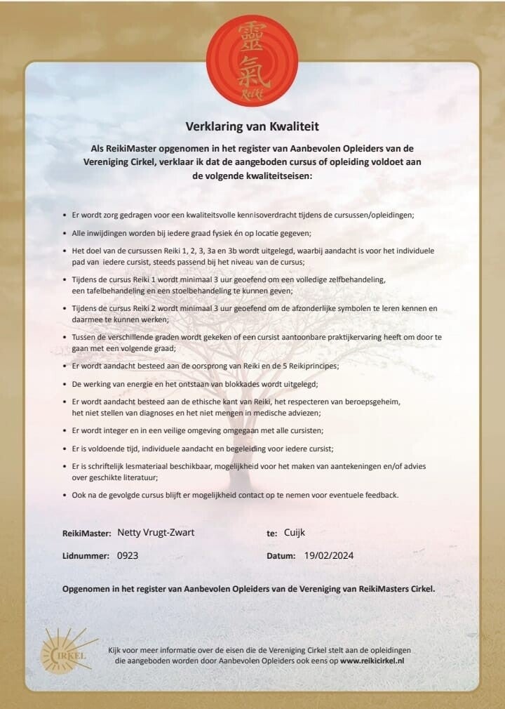 Voor de cursussen Reiki volgens de Usui methode zoals "By Netty" deze geeft hebben wij een verklaring van kwaliteit als